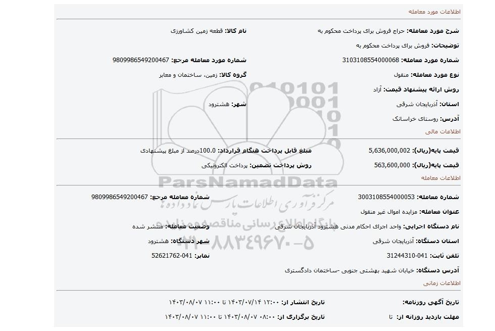| نام دستگاه اجرایی: واحد اجرای احکام مدنی هشترود آذربایجان شرقی | وضعیت معامله: منتشر شده | |