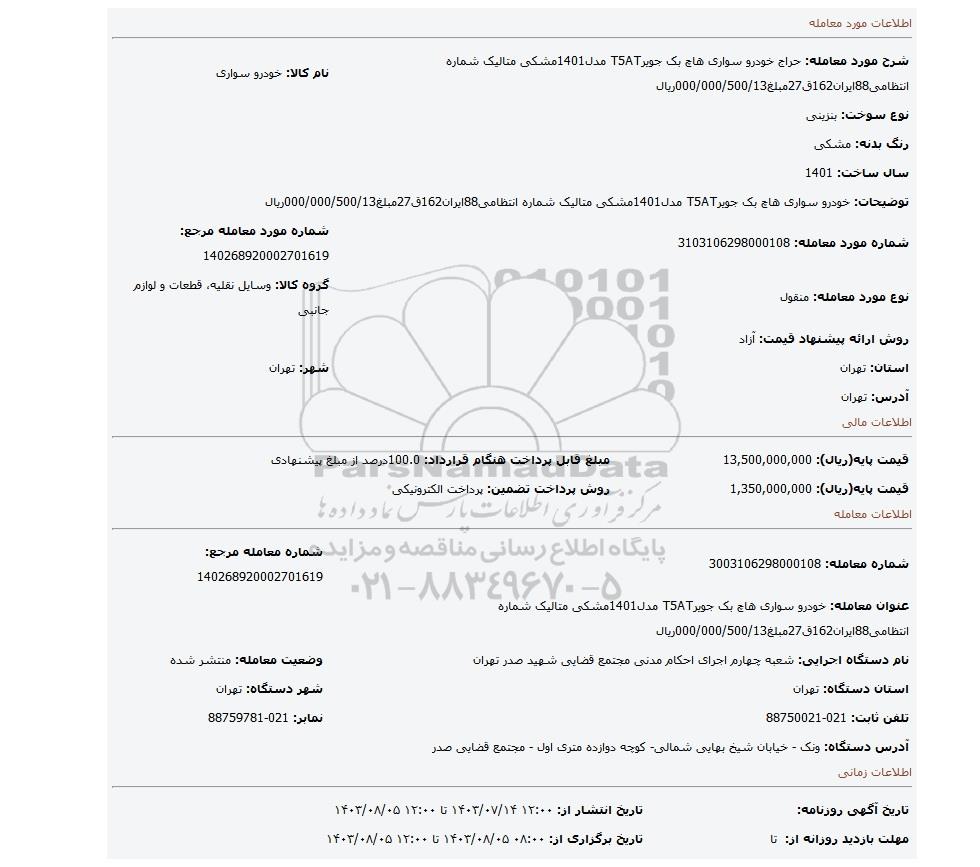 | توضیحات: خودرو سواری هاچ بک جویرT5AT مدل1401مشکی متالیک شماره انتظامی88ایران162ق27مبلغ000/000/500/13ریال | ||