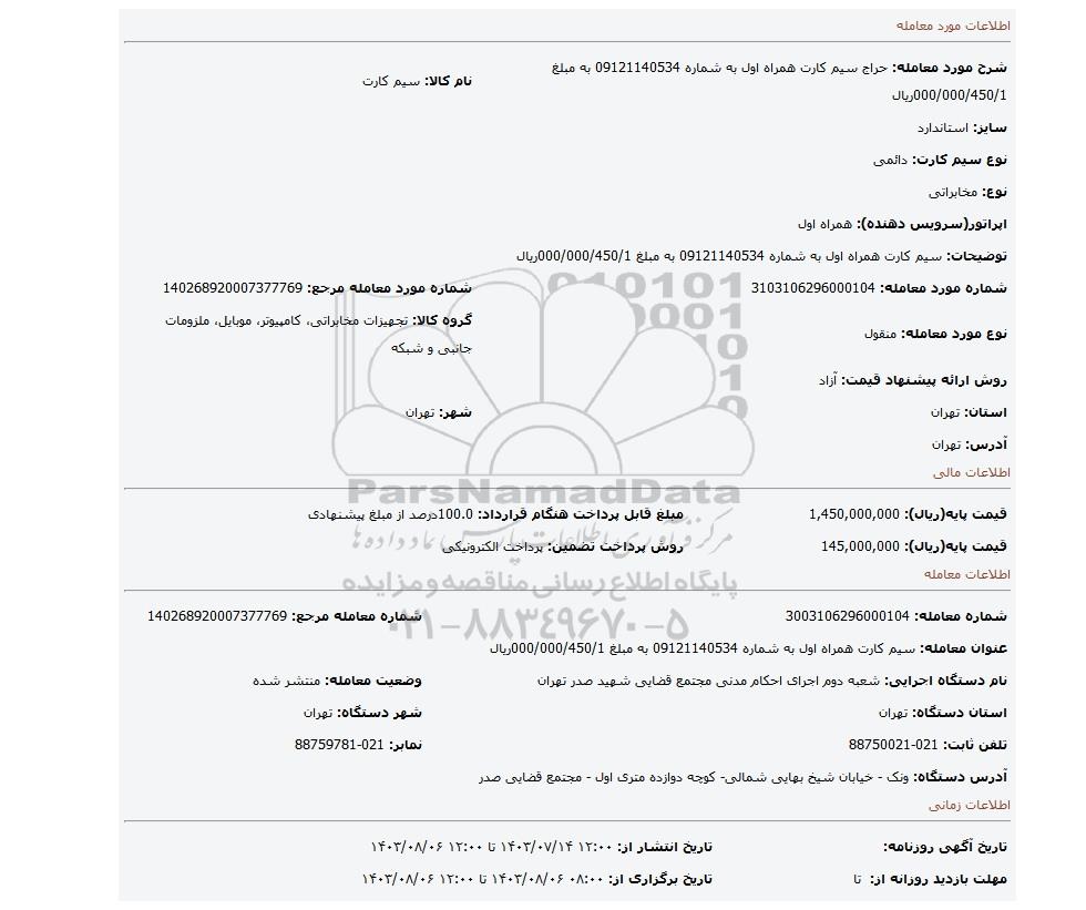 | شرح مورد معامله: حراج سیم کارت همراه اول به شماره 09121140534 به مبلغ 000/000/450/1ریال | نام کالا: سیم کارت | |