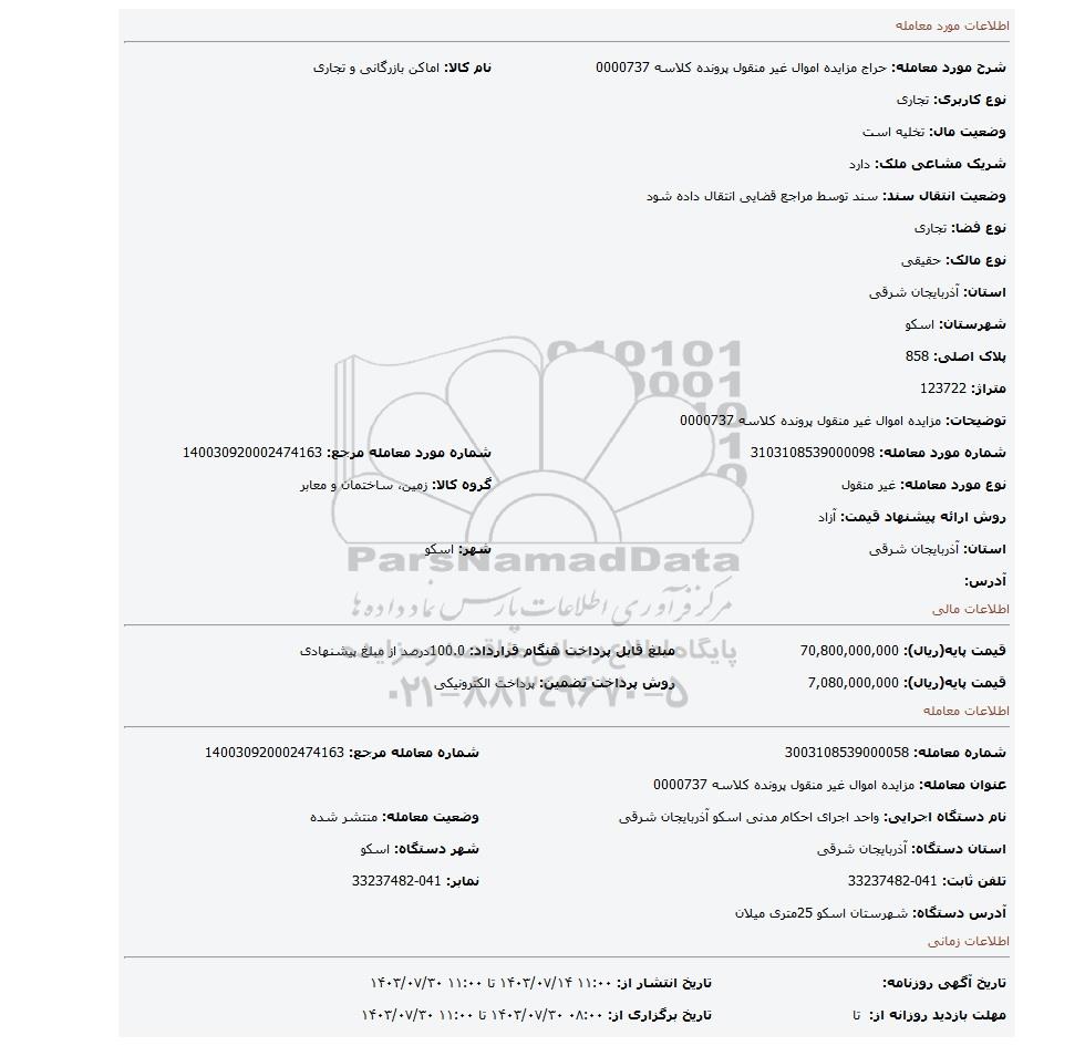 | شرح مورد معامله: حراج مزایده اموال غیر منقول پرونده کلاسه 0000737 | نام کالا: اماکن بازرگانی و تجاری | |