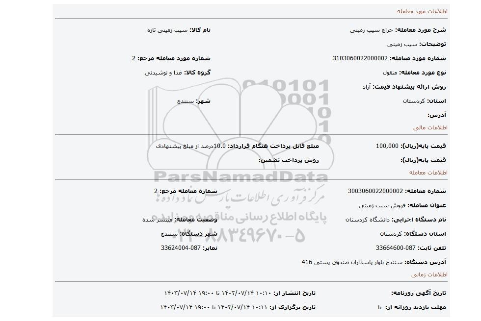 | شرح مورد معامله: حراج سیب زمینی | نام کالا: سیب زمینی تازه | |