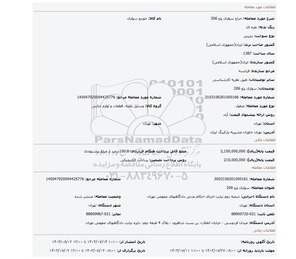 | شماره مورد معامله: 3103106301000166 | شماره مورد معامله مرجع: 140047920004425776 | |