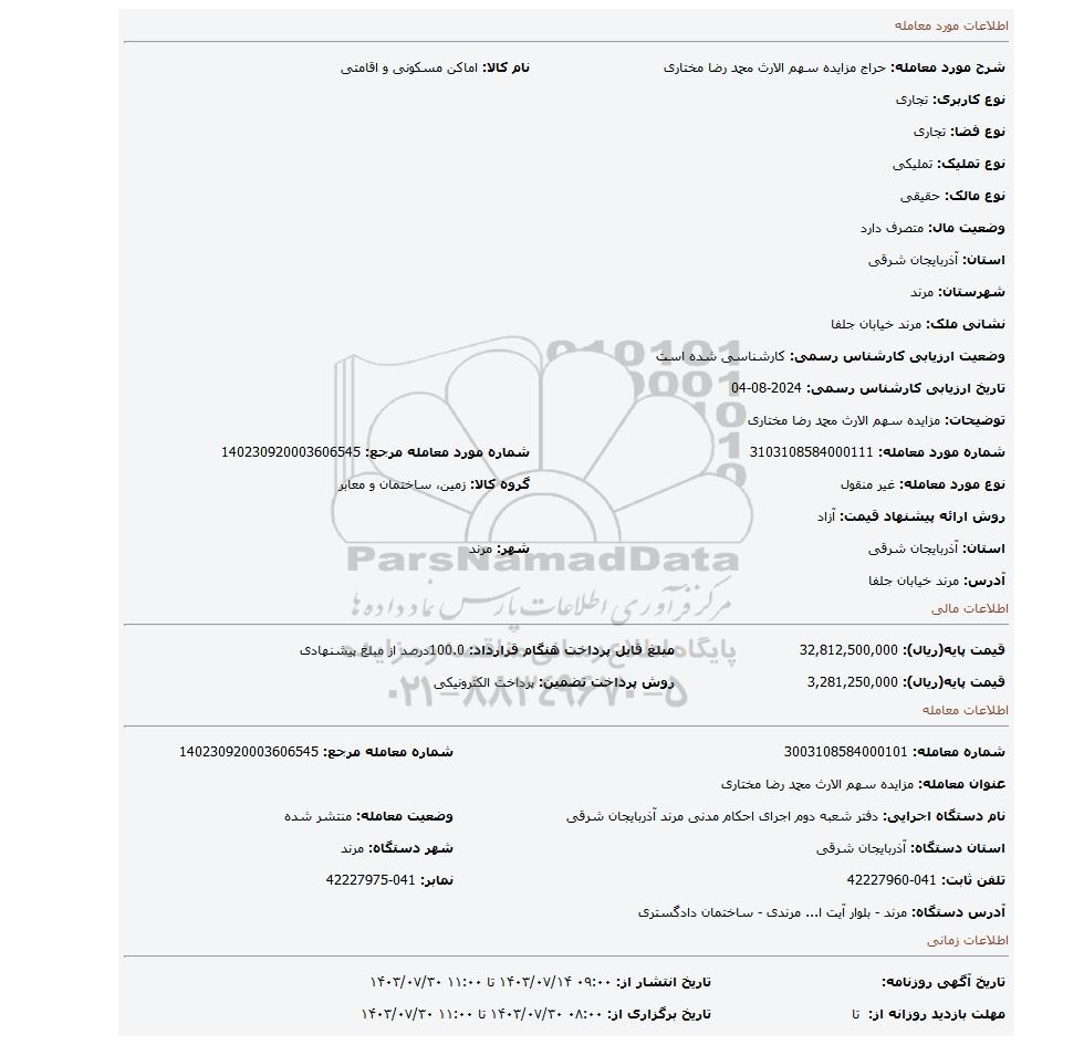 | عنوان معامله: مزایده سهم الارث محمد رضا مختاری | ||
