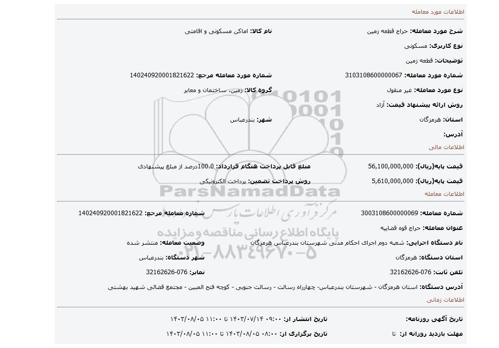 شرح مورد معامله: حراج قطعه زمیننام کالا: اماکن مسکونی و اقامتی