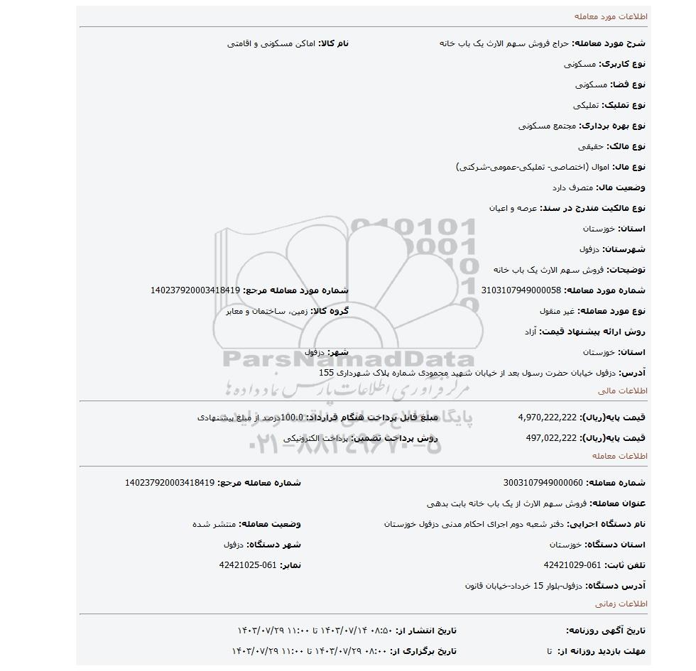 | شماره مورد معامله: 3103107949000058 | شماره مورد معامله مرجع: 140237920003418419 | |