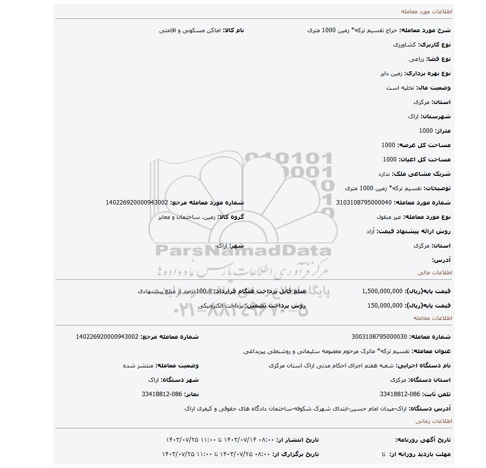 | شرح مورد معامله: حراج تقسیم ترکه* زمین 1000 متری | نام کالا: اماکن مسکونی و اقامتی | |