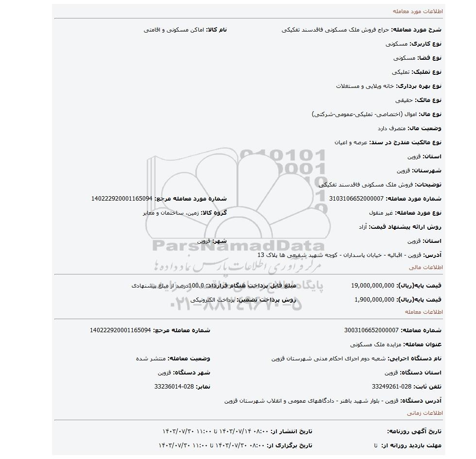 مزایده عمومی مزایده فروش ملک مسکونی فاقدسند تفکیکی برگزار میگردد. از کلیه افراد متخصص و شرکت‌های واجد شرایط دعوت به عمل می‌آید تا در این مزایده با کد خبرگزاری پارس نماد : 8084369 شرکت نمایند تاریخ شروع مزایده : 1403/07/14 مهلت شرکت در مزایده: تا پایان روز 1403/07/30 مکان برگزاری اموال واگذاری استان‌های قزوین و دسته‌بندی‌های مربوط به این حراجی املاک و زمین میباشد.