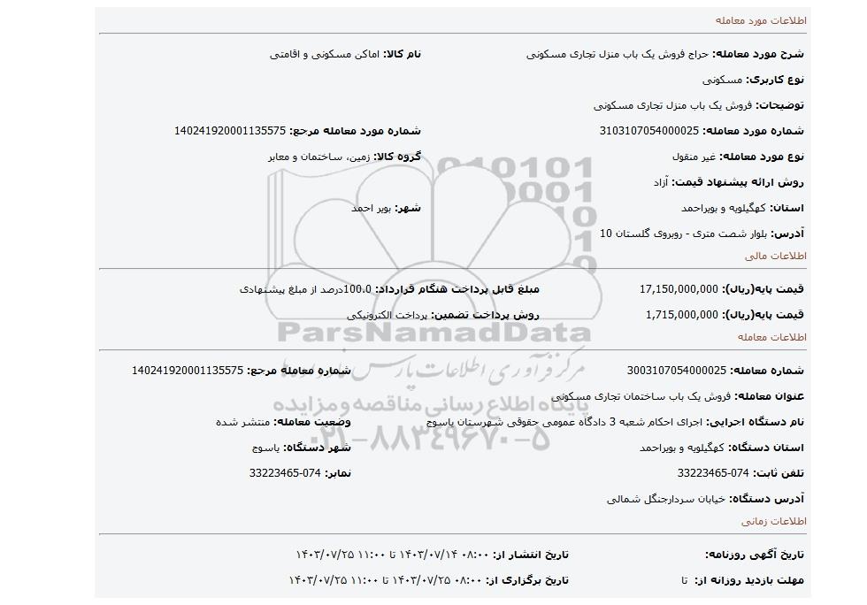 نام دستگاه اجرایی: اجرای احکام شعبه 3 دادگاه عمومی حقوقی شهرستان یاسوجوضعیت معامله: منتشر شده