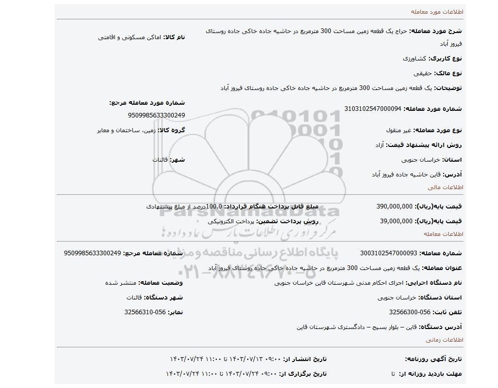 | شماره مورد معامله: 3103102547000094 | شماره مورد معامله مرجع: 9509985633300249 | |