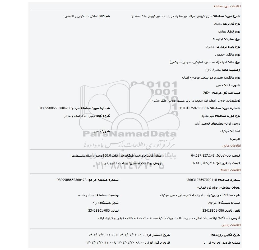 | شرح مورد معامله: حراج فروش اموال غیر منقول در باب دستور فروش ملک مشاع | نام کالا: اماکن مسکونی و اقامتی | |