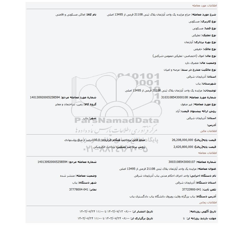 | شرح مورد معامله: حراج مزایده یک واحد آپارتمان پلاک ثبتی 21108 فرعی از 13495 اصلی | نام کالا: اماکن مسکونی و اقامتی | |