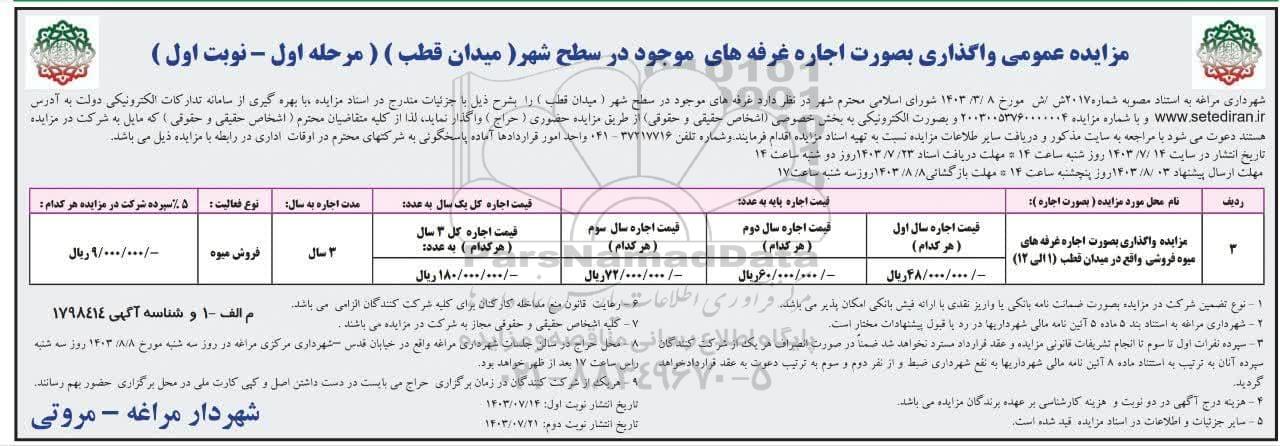 | 3 | مزایده واگذاری بصورت اجاره غرفه های میوه فروشی واقع در میدان قطب (1 الی 12) | قیمت اجاره سال اول (هر کدام) | قیمت اجاره سال دوم (هر کدام) | قیمت اجاره سال سوم (هر کدام) | قیمت اجاره کل 3 سال (هر کدام) به عدد: | 3 سال | فروش میوه | 9.000.000 ریال | ||