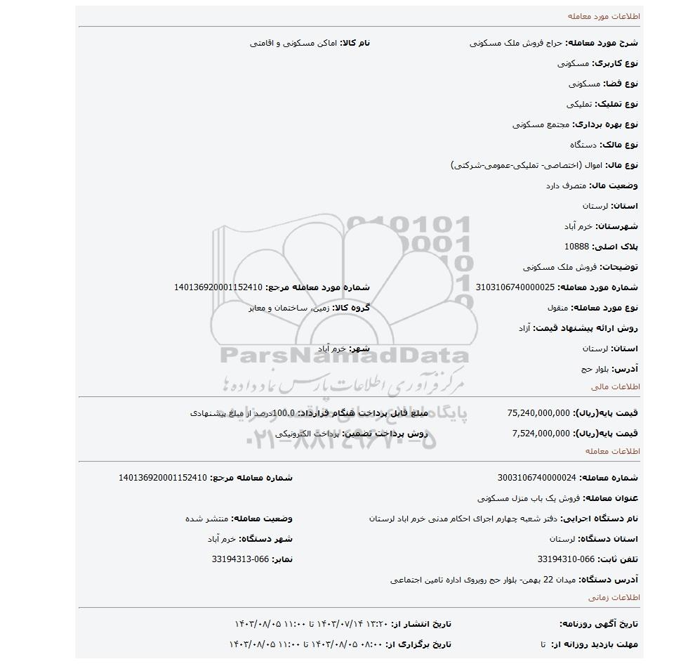 شرح مورد معامله: حراج فروش ملک مسکونینام کالا: اماکن مسکونی و اقامتی