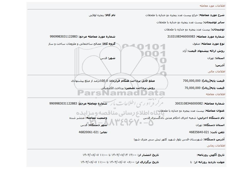| شماره مورد معامله: 3103108346000083 | شماره مورد معامله مرجع: 9909983031122883 | |