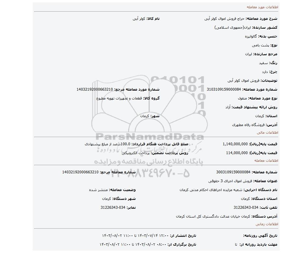 مزایده فروش اموال کولر آبی, مزایده، فروش اموال کولر آبی