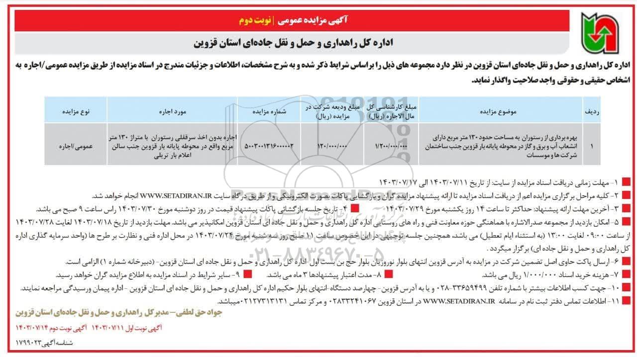 اداره کل راهداری و حمل و نقل جاده ای استان قزوین در نظر دارد مورد ذیل را بر اساس شرایط ذکر شده و به شرح مشخصات اطلاعات و جزئیات مندرج در اسناد مزایده از طریق مزایده عمومی به اشخاص حقیقی و حقوقی واجد صلاحیت واگذار نماید.