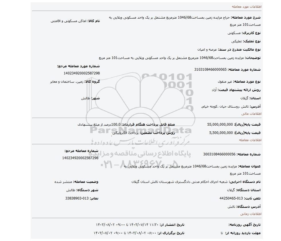شرح مورد معامله: حراج مزایده زمین بمساحت1046/68 مترمربع مشتمل بر یک واحد مسکونی ویلایی به مساحت101 متر مربع نام کالا: اماکن مسکونی و اقامتی