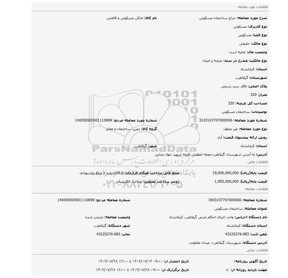 | شماره مورد معامله: 3103107707000006 | شماره مورد معامله مرجع: 140050920001110699 | |