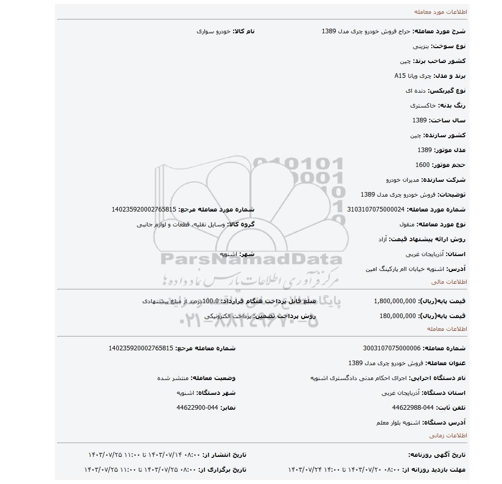| شرح مورد معامله: حراج فروش خودرو چری مدل 1389 | نام کالا: خودرو سواری | |