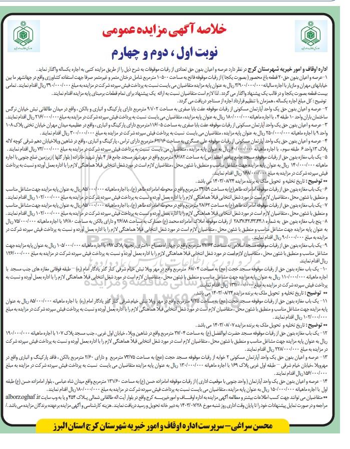 اداره اوقاف و امور خیریه شهرستان کرج در نظر دارد عرصه و اعیان بدون حق تعدادی از رقبات موقوفات به شرح ذیل را از طریق مزایده کتبی به اجاره یکساله واگذار نماید.