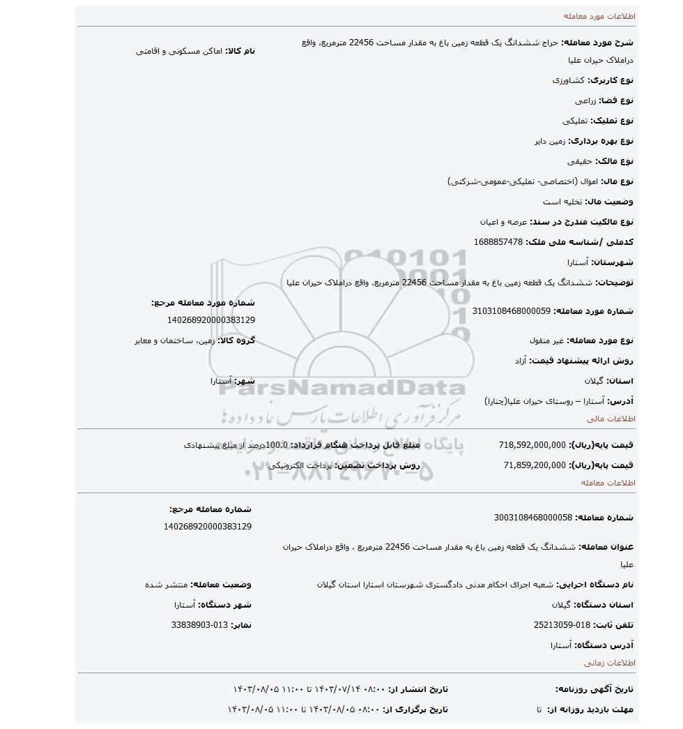 | شرح مورد معامله: حراج ششدانگ یک قطعه زمین باغ به مقدار مساحت 22456 مترمربع، واقع دراملاک حیران علیا | نام کالا: اماکن مسکونی و اقامتی | |