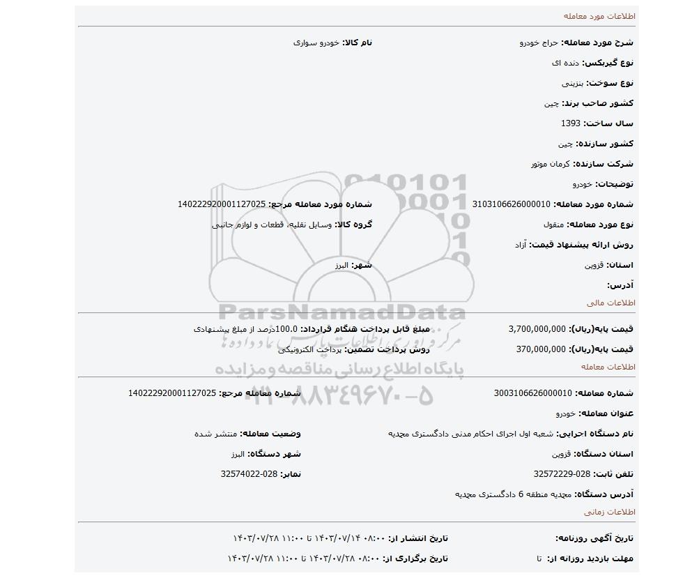 | قیمت پایه(ریال): 370,000,000 | روش پرداخت تضمین: پرداخت الکترونیکی |