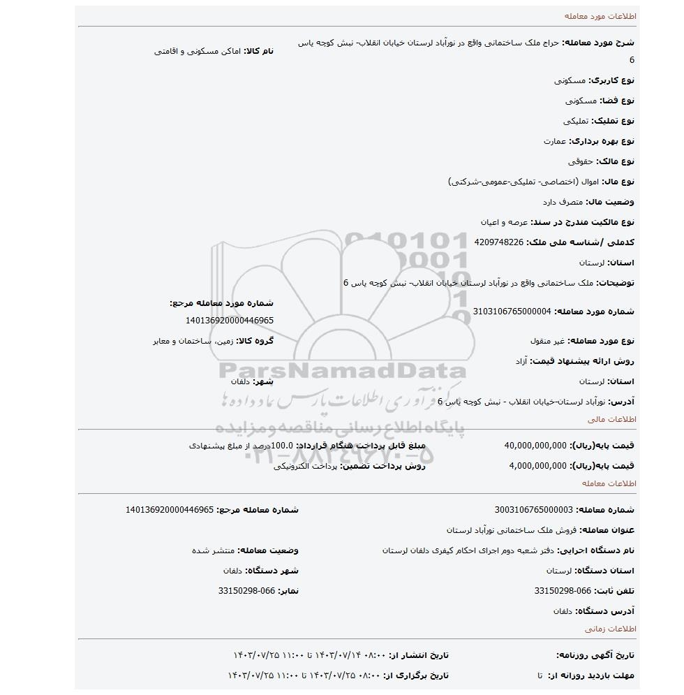 | شرح مورد معامله: حراج ملک ساختمانی واقع در نورآباد لرستان خیابان انقلاب- نبش کوچه یاس 6 | نام کالا: اماکن مسکونی و اقامتی | |