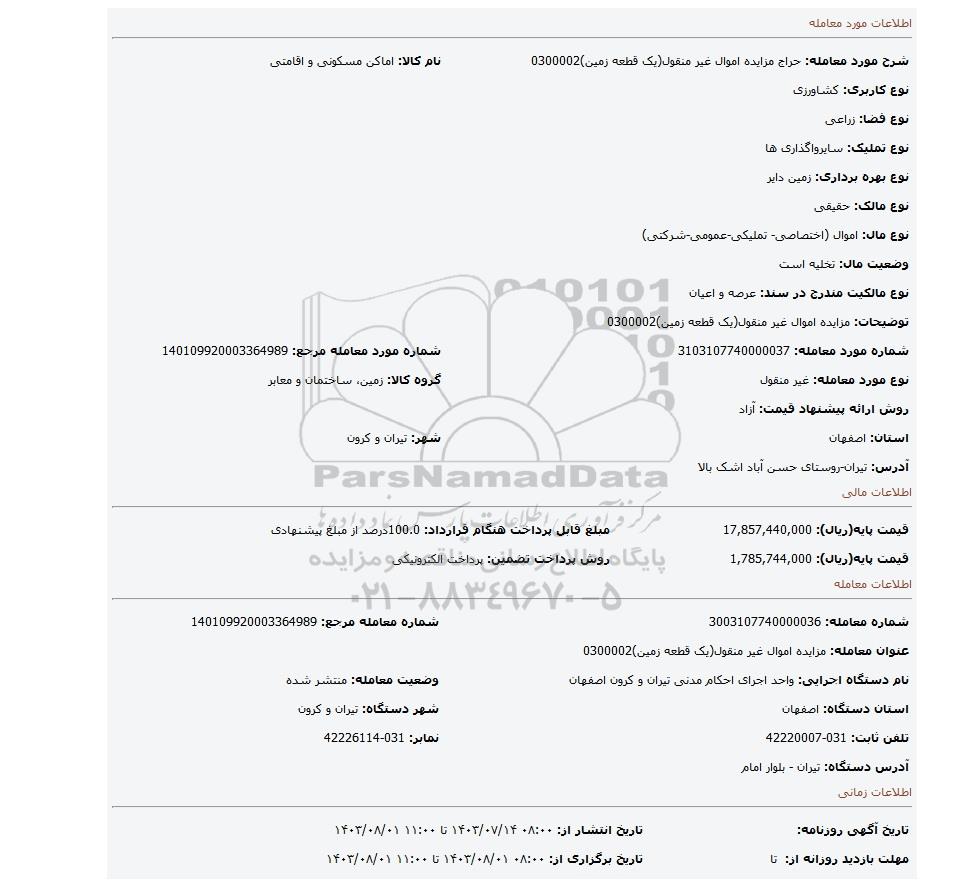 قیمت پایه(ریال): 1,785,744,000روش پرداخت تضمین: پرداخت الکترونیکی