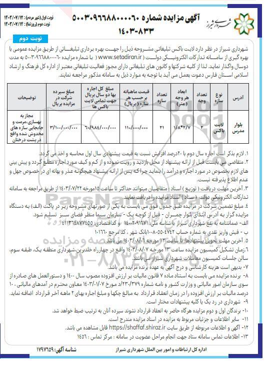 شهرداری شیراز در نظر دارد لایت باکس تبلیغاتی مشروحه ذیل را جهت بهره برداری تبلیغاتی از طریق مزایده عمومی با بهره گیری از سامانه تدارکات الکترونیکی دولت (ستاد) با شماره مزایده 5003096688000060 به مدت دو سال واگذار نماید. لذا از کلیه شرکتها و کانونهای تبلیغاتی دارای مجوز فعالیت تبلیغاتی معتبر از اداره کل فرهنگ و ارشاد اسلامی استان فارس دعوت بعمل می آید با توجه به موارد ذیل به سامانه مذکور مراجعه نمایند.