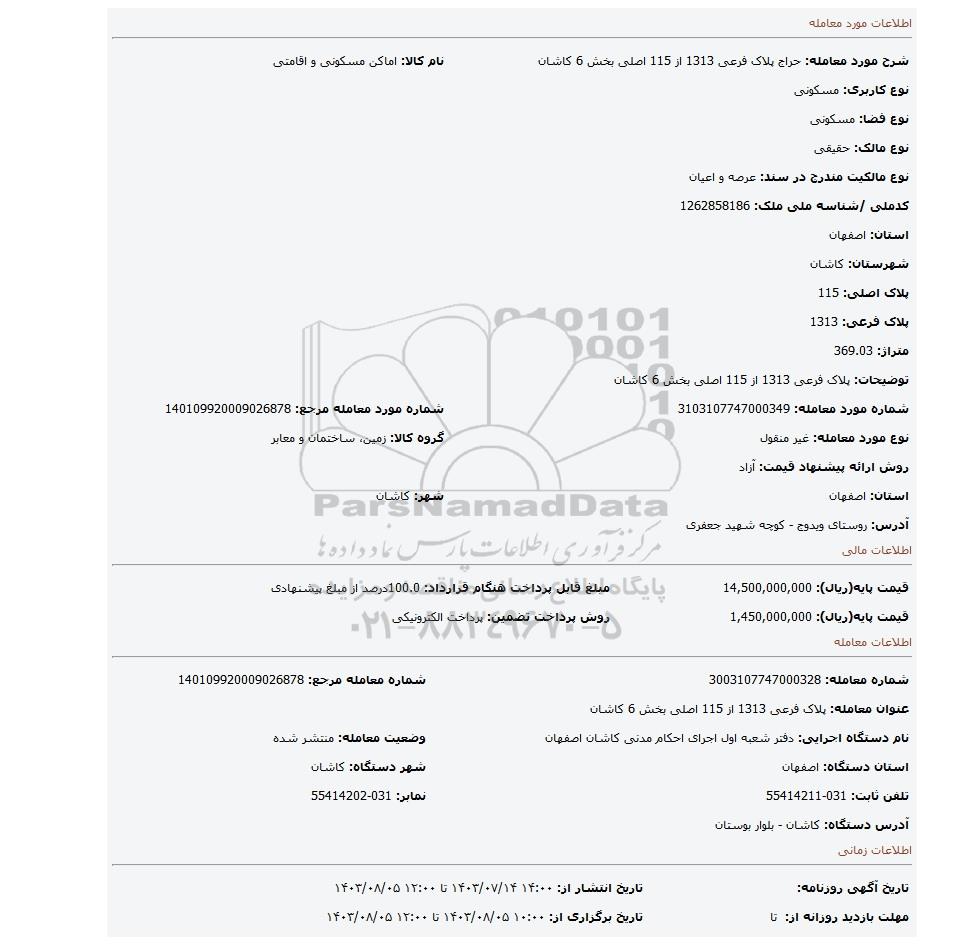 | شرح مورد معامله: حراج پلاک فرعی 1313 از 115 اصلی بخش 6 کاشان | نام کالا: اماکن مسکونی و اقامتی | |