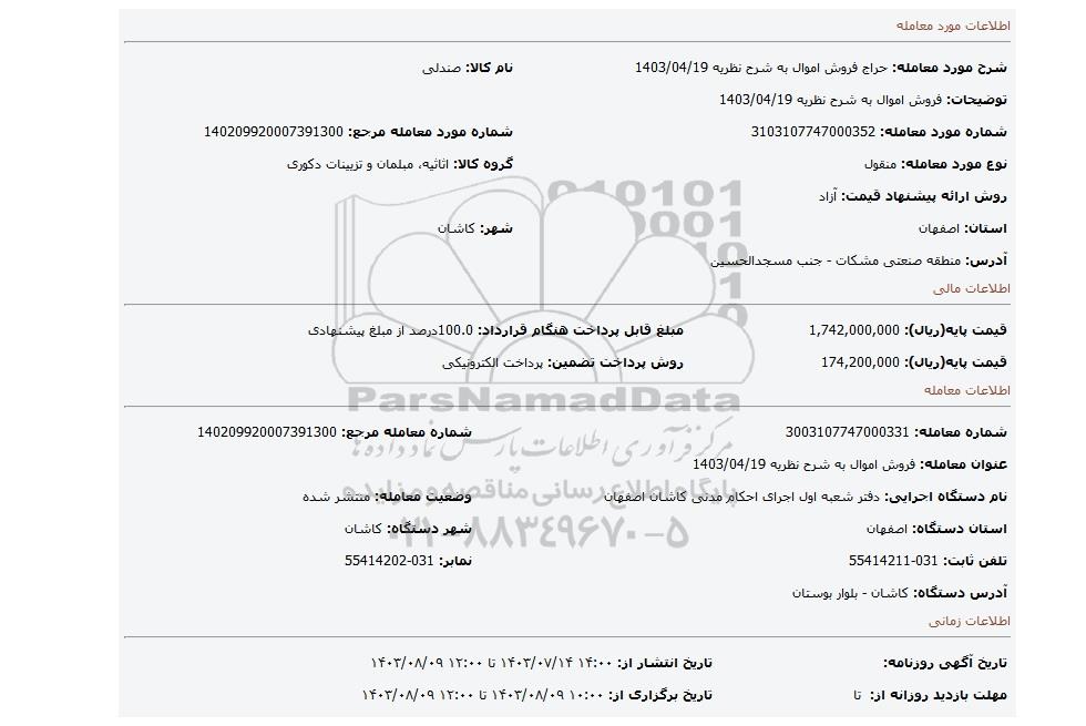 | شرح مورد معامله: حراج فروش اموال به شرح نظریه 1403/04/19 | نام کالا: صندلی | |