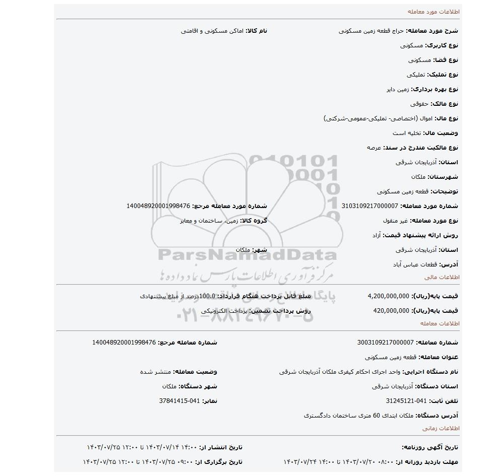 | شماره مورد معامله: 3103109217000007 | شماره مورد معامله مرجع: 140048920001998476 | |
