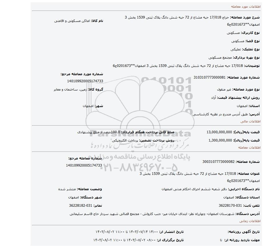 | شرح مورد معامله: حراج 17/018 حبه مشاع از 72 حبه شش دانگ پلاک ثبتی 1539 بخش 3 اصفهان**0201673ج6 | نام کالا: اماکن مسکونی و اقامتی | |