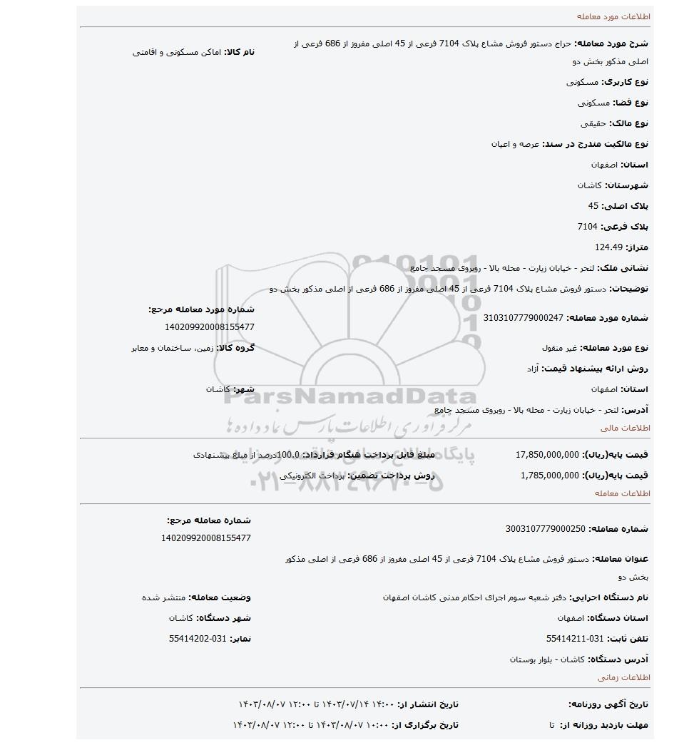 | شرح مورد معامله: حراج دستور فروش مشاع پلاک 7104 فرعی از 45 اصلی مفروز از 686 فرعی از اصلی مذکور بخش دو | نام کالا: اماکن مسکونی و اقامتی | |