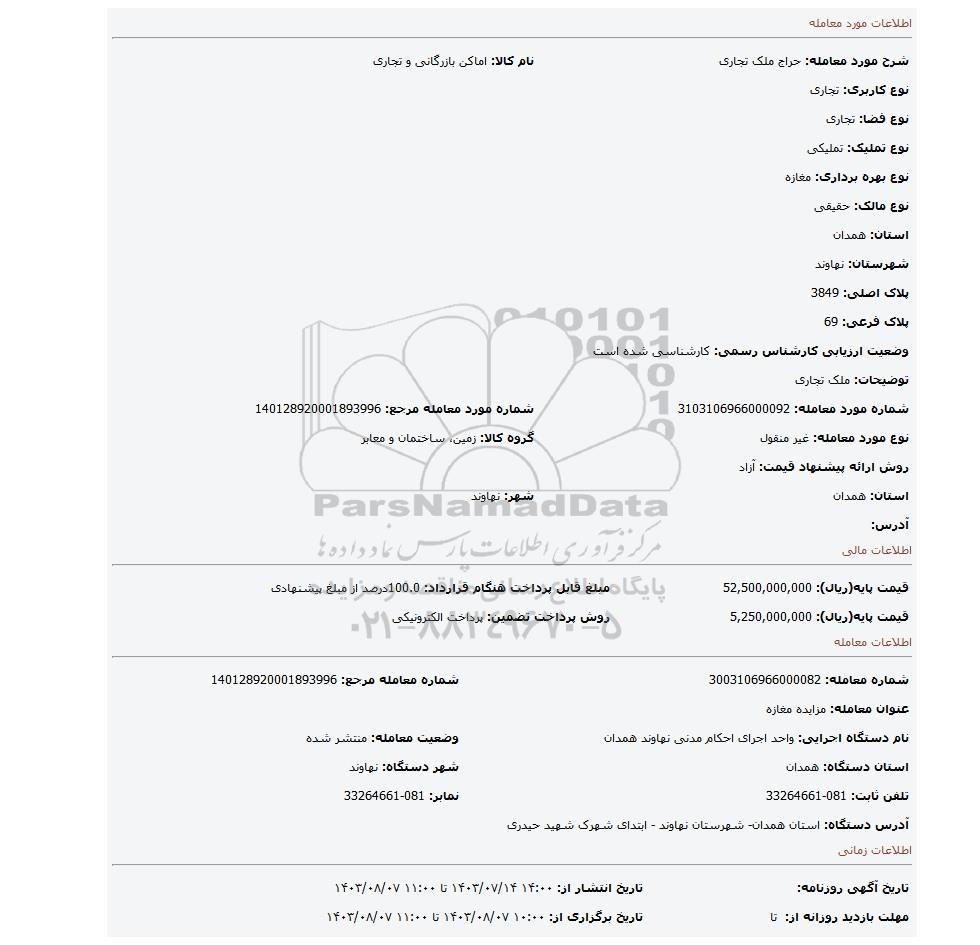 | نام دستگاه اجرایی: واحد اجرای احکام مدنی نهاوند همدان | وضعیت معامله: منتشر شده | |