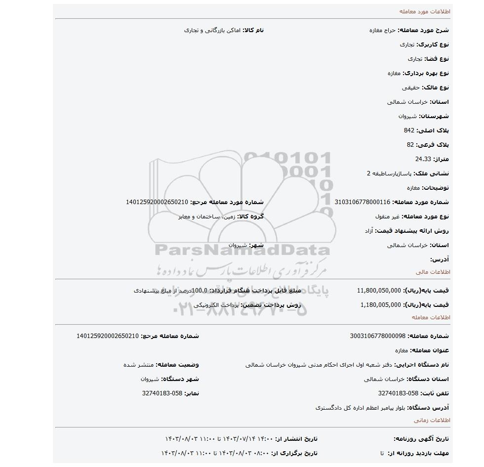 | شماره مورد معامله: 3103106778000116 | شماره مورد معامله مرجع: 140125920002650210 | |