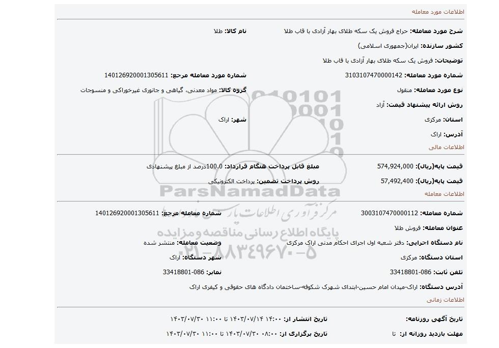 مزایده فروش یک سکه طلای بهار آزادی با قاب طلا, مزایده، فروش یک سکه طلای بهار آزادی با قاب طلا