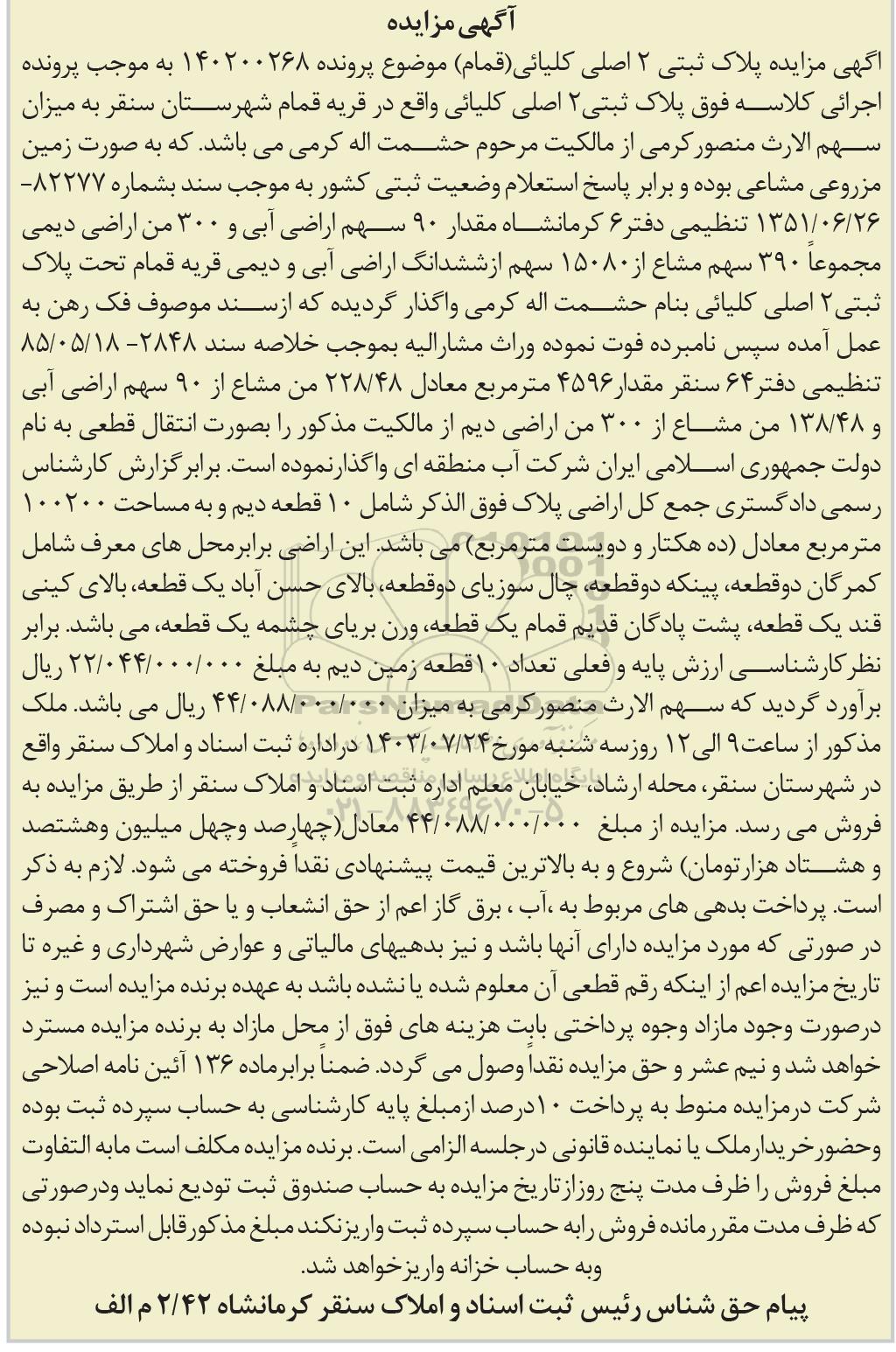 مزایده عمومی مزایده مقدار 90 سهم اراضی آبی و 300 من اراضی دیمی مجموعا 390 سهم مشاع برگزار میگردد. از کلیه افراد متخصص و شرکت‌های واجد شرایط دعوت به عمل می‌آید تا در این مزایده با کد خبرگزاری پارس نماد : 8084784 شرکت نمایند تاریخ شروع مزایده : 1403/07/08 مهلت شرکت در مزایده: تا پایان روز 1403/07/24 مکان برگزاری اموال واگذاری استان‌های کرمانشاه و دسته‌بندی‌های مربوط به این حراجی ماشین آلات و تجهیزات کشاورزی و دام پروری, املاک و زمین میباشد.