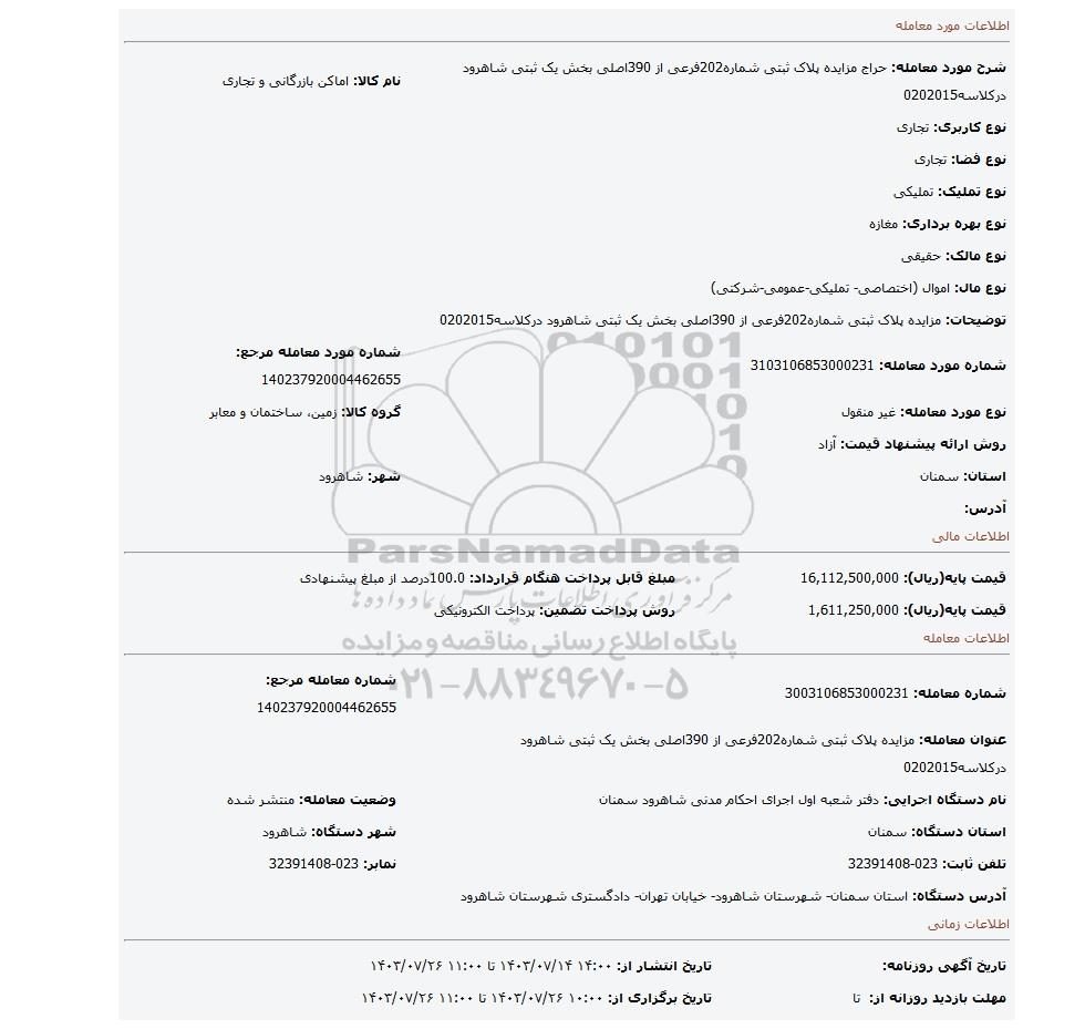 | شرح مورد معامله: حراج مزایده پلاک ثبتی شماره202فرعی از 390اصلی بخش یک ثبتی شاهرود درکلاسه0202015 | نام کالا: اماکن بازرگانی و تجاری | |