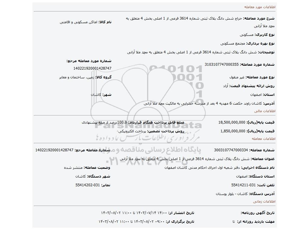 شرح مورد معامله: حراج شش دانگ پلاک ثبتی شماره 3614 فرعی از 1 اصلی بخش 4 متعلق به محمد ملا آرانینام کالا: اماکن مسکونی و اقامتی