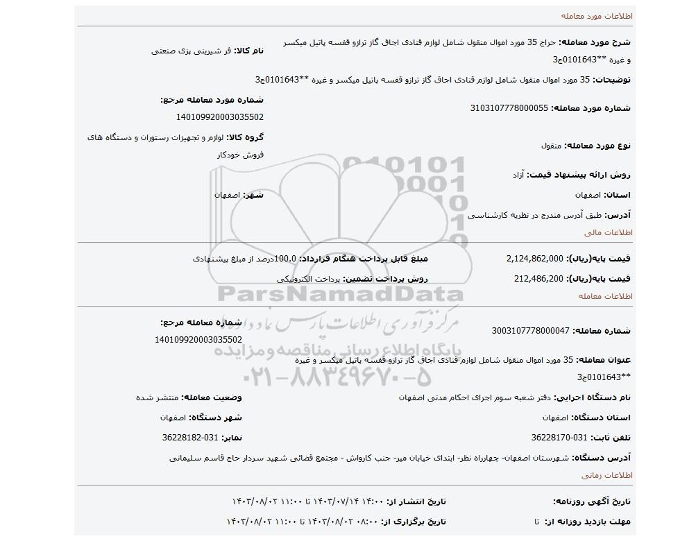 | عنوان معامله: 35 مورد اموال منقول شامل لوازم قنادی اجاق گاز ترازو قفسه پاتیل میکسر و غیره **0101643ج3 | ||