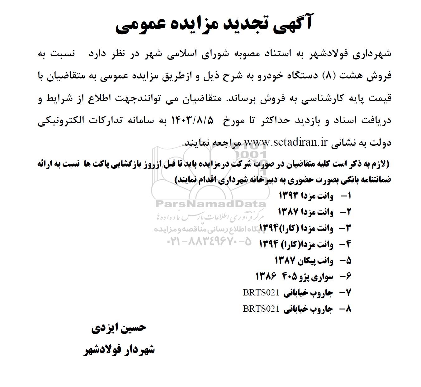 شهرداری فولاد شهر به استناد مصوبه شورای اسلامی شهر در نظر دارد نسبت به فروش هشت (8) دستگاه خودرو به شرح ذیل و از طریق مزایده عمومی به متقاضیان با قیمت پایه کارشناسی به فروش برساند متقاضیان میتوانند جهت اطلاع از شرایط و دریافت اسناد و بازدید حداکثر تا مورخ 1403.8.5 به سامانه تدارکات الکترونیکی دولت ستاد ایران مراجعه نمایند.