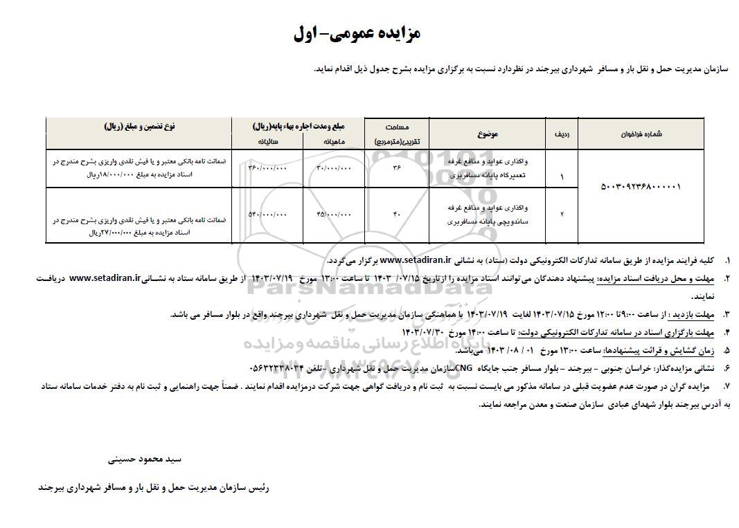 سازمان مدیریت حمل و نقل بار و مسافر شهرداری بیرجند در نظر دارد نسبت به برگزاری مزایده بشرح جدول ذیل اقدام نماید.