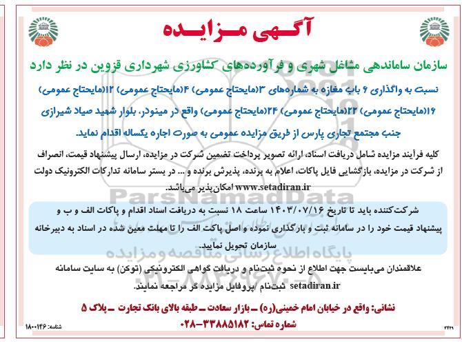 سازمان ساماندهی مشاغل شهری و فرآورده های کشاورزی شهرداری قزوین در نظر دارد نسبت به واگذاری 6 باب مغازه به شماره های 3 (مایحتاج عمومی) 4 (مایحتاج عمومی) 12 (مایحتاج عمومی) 16 (مایحتاج عمومی) 22 (مایحتاج عمومی) 24(مایحتاج عمومی) واقع در مینودر، بلوار شهید صیاد شیرازی جنب مجتمع تجاری پارس از طریق مزایده عمومی به صورت اجاره یکساله اقدام نماید.