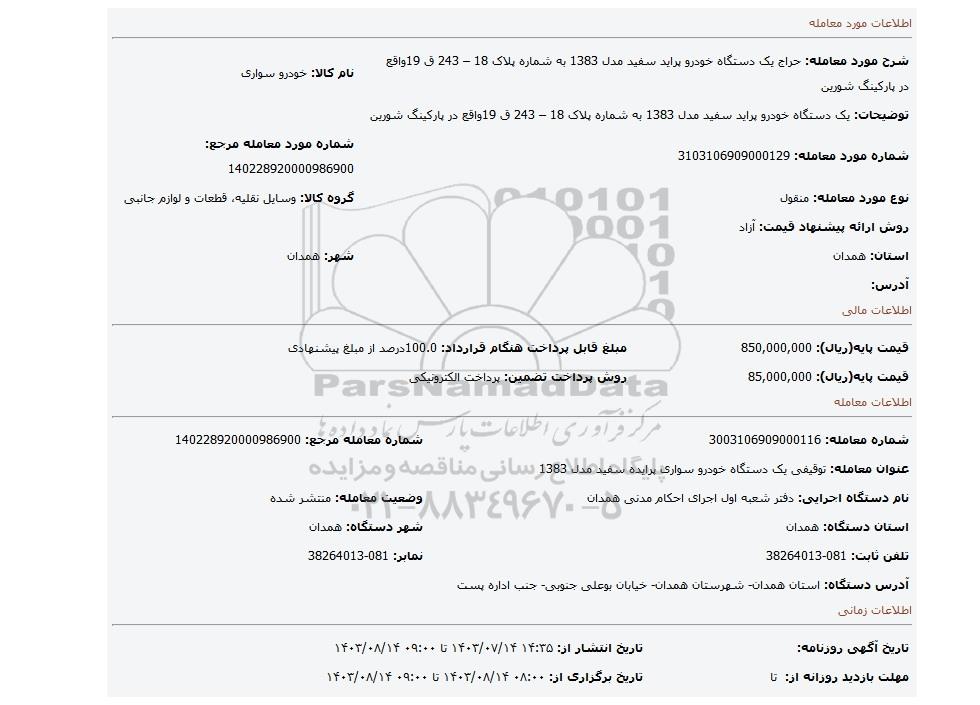عنوان معامله: توقیفی یک دستگاه خودرو سواری پرایده سفید مدل 1383