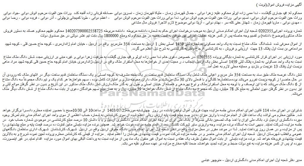 شماره پرونده اجرایی0202355 شعبه اول اجرای احکام مدنی اردبیل به موجب درخواست اجرای حکم به شماره دادنامه مربوطه دادنامه مربوطه 140207390002558725 محکوم علیهم محکوم هستند به دستور فروش ملک مذکور(موضوع دادنامه) و تقسیم وجه حاصله پس از کسر هزینه عملیات اجرایی بین طرفین به نسبت حصه در حق محکوم له ومبلغ 1800000 ریال بابت نیم عشر دولتی در حق صندوق دولت