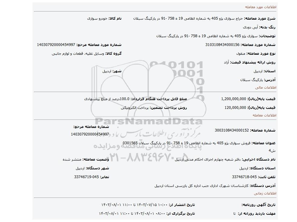 عنوان معامله: فروش سواری پژو 405 به شماره اتظامی 19 ه 758 -91 در پارکینگ سبلان 0301565 ش4 | ||