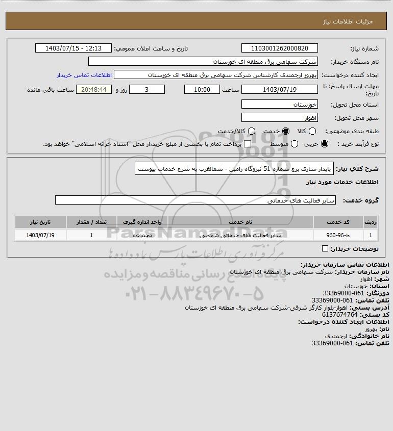 استعلام پایدار سازی برج شماره 51 نیروگاه رامین - شمالغرب به شرح خدمات پیوست, استعلام پایدار سازی برج شماره 51 نیروگاه رامین - شمالغرب به شرح خدمات پیوست