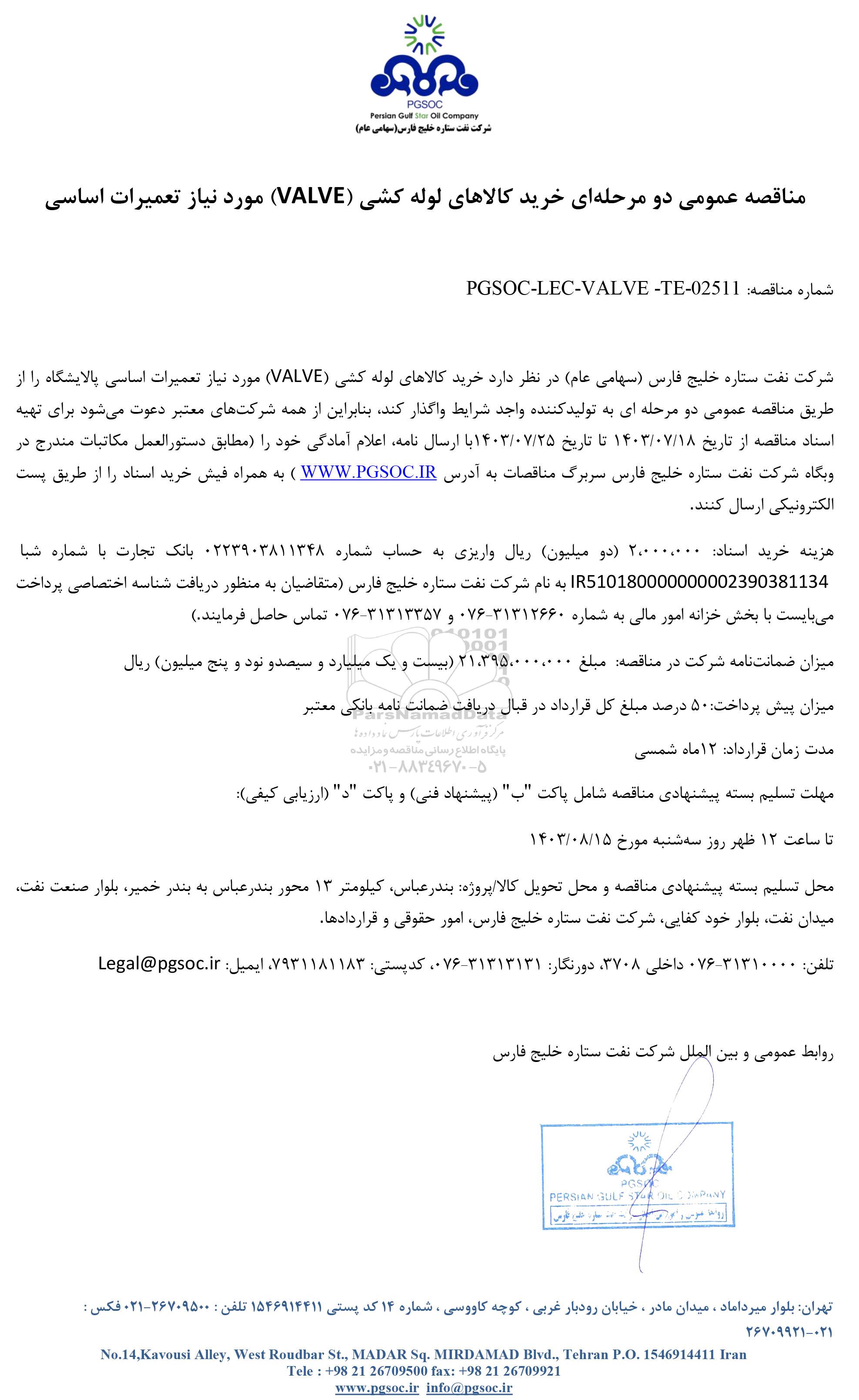 شماره مناقصه: PGSOC-LEC-VALVE - TE-02511