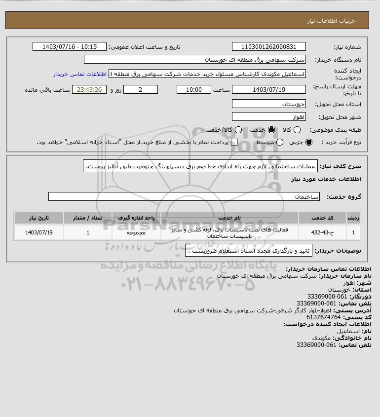 استعلام عملیات ساختمانی لازم جهت راه اندازی خط دوم برق دیسپاچینگ جنوبغرب طبق آنالیز پیوست., استعلام عملیات ساختمانی لازم جهت راه اندازی خط دوم برق دیسپاچینگ جنوبغرب طبق آنالیز پیوست.